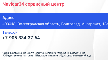 Navicar34, сервисный центр по адресу 400048, Волгоградская область, Волгоград, Ангарская, 184 в дальнейшем Организация, размещена в следующих категориях: