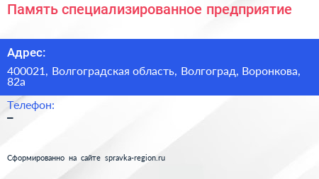 Память, специализированное предприятие по адресу 400021, Волгоградская область, Волгоград, Воронкова, 82а в дальнейшем Организация, размещена в следующих категориях: