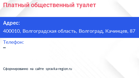 Платный общественный туалет по адресу 400010, Волгоградская область, Волгоград, Качинцев, 87 в дальнейшем Организация, размещена в следующих категориях:
