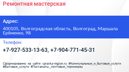 Ремонтная мастерская по адресу 400105, Волгоградская область, Волгоград, Маршала Ерёменко, 98 в дальнейшем Организация, размещена в следующих категориях: