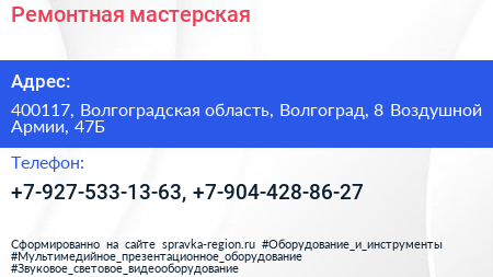 Ремонтная мастерская по адресу 400117, Волгоградская область, Волгоград, 8 Воздушной Армии, 47Б в дальнейшем Организация, размещена в следующих категориях: