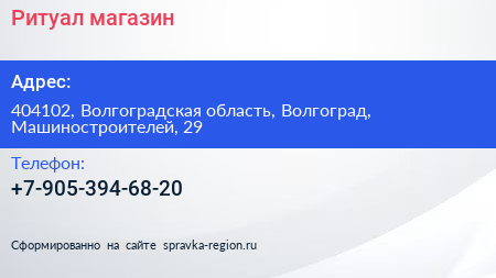 Ритуал, магазин по адресу 404102, Волгоградская область, Волгоград, Машиностроителей, 29 в дальнейшем Организация, размещена в следующих категориях: