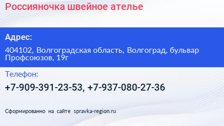 Россияночка, швейное ателье по адресу 404102, Волгоградская область, Волгоград, бульвар Профсоюзов, 19г в дальнейшем Организация, размещена в следующих категориях: