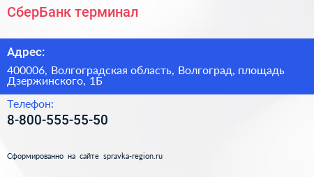 СберБанк, терминал по адресу 400006, Волгоградская область, Волгоград, площадь Дзержинского, 1Б в дальнейшем Организация, размещена в следующих категориях: