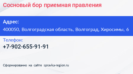 Сосновый бор, приемная правления по адресу 400050, Волгоградская область, Волгоград, Хиросимы, 6 в дальнейшем Организация, размещена в следующих категориях: