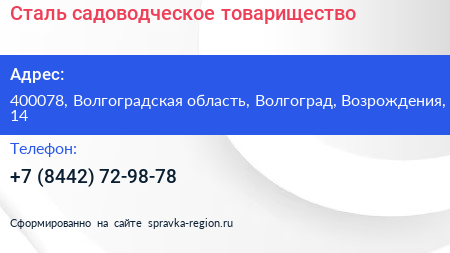 Сталь, садоводческое товарищество по адресу 400078, Волгоградская область, Волгоград, Возрождения, 14 в дальнейшем Организация, размещена в следующих категориях: