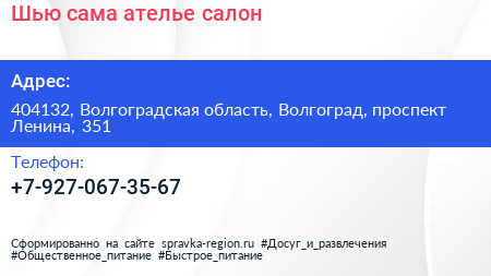 Шью сама, ателье-салон по адресу 404132, Волгоградская область, Волгоград, проспект Ленина, 351 в дальнейшем Организация, размещена в следующих категориях: