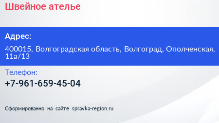 Швейное ателье по адресу 400015, Волгоградская область, Волгоград, Ополченская, 11а/13 в дальнейшем Организация, размещена в следующих категориях: