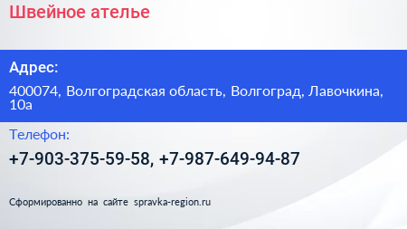 Швейное ателье по адресу 400074, Волгоградская область, Волгоград, Лавочкина, 10а в дальнейшем Организация, размещена в следующих категориях: