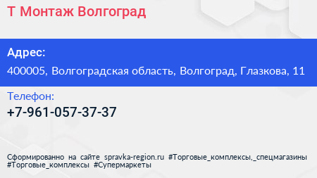 Т-Монтаж Волгоград по адресу 400005, Волгоградская область, Волгоград, Глазкова, 11 в дальнейшем Организация, размещена в следующих категориях: