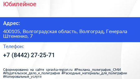 Юбилейное по адресу 400105, Волгоградская область, Волгоград, Генерала Штеменко, 7 в дальнейшем Организация, размещена в следующих категориях: