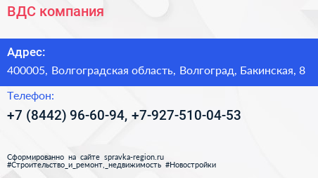 ВДС, компания по адресу 400005, Волгоградская область, Волгоград, Бакинская, 8 в дальнейшем Организация, размещена в следующих категориях: