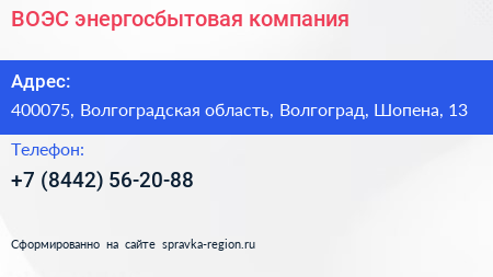 ВОЭС, энергосбытовая компания по адресу 400075, Волгоградская область, Волгоград, Шопена, 13 в дальнейшем Организация, размещена в следующих категориях: