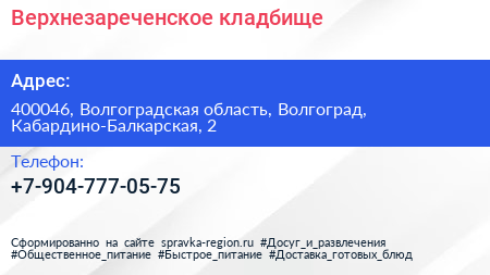 Верхнезареченское кладбище по адресу 400046, Волгоградская область, Волгоград, Кабардино-Балкарская, 2 в дальнейшем Организация, размещена в следующих категориях: