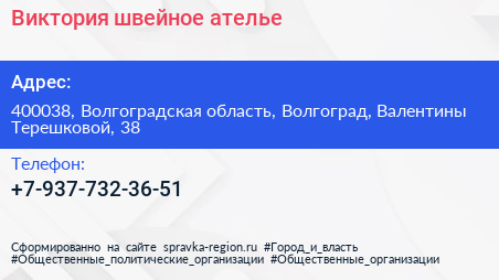 Виктория, швейное ателье по адресу 400038, Волгоградская область, Волгоград, Валентины Терешковой, 38 в дальнейшем Организация, размещена в следующих категориях: