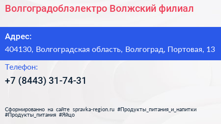 Волгоградоблэлектро, Волжский филиал по адресу 404130, Волгоградская область, Волгоград, Портовая, 13 в дальнейшем Организация, размещена в следующих категориях:
