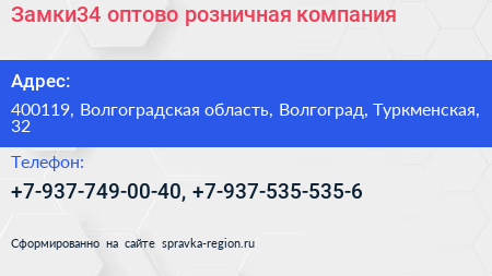 Замки34, оптово-розничная компания по адресу 400119, Волгоградская область, Волгоград, Туркменская, 32 в дальнейшем Организация, размещена в следующих категориях: