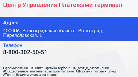 Центр Управления Платежами, терминал по адресу 400006, Волгоградская область, Волгоград, Переяславская, 1 в дальнейшем Организация, размещена в следующих категориях: