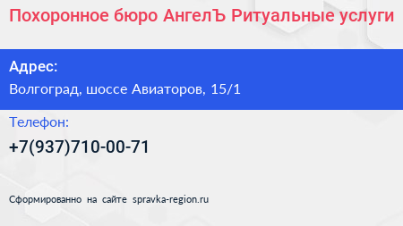 Похоронное бюро АнгелЪ - Ритуальные услуги по адресу Волгоград, шоссе Авиаторов, 15/1 в дальнейшем Организация, размещена в следующих категориях: