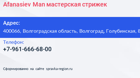 Afanasiev Man, мастерская стрижек по адресу 400066, Волгоградская область, Волгоград, Голубинская, 8 в дальнейшем Организация, размещена в следующих категориях: