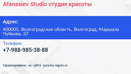 Afanasiev Studio, студия красоты по адресу 400005, Волгоградская область, Волгоград, Маршала Чуйкова, 37 в дальнейшем Организация, размещена в следующих категориях: