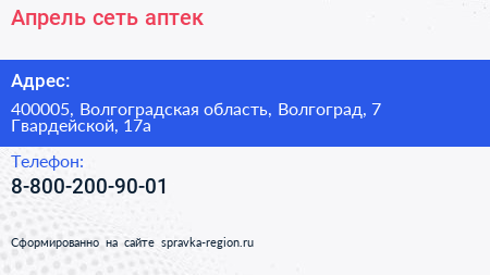 Апрель, сеть аптек по адресу 400005, Волгоградская область, Волгоград, 7 Гвардейской, 17а в дальнейшем Организация, размещена в следующих категориях:
