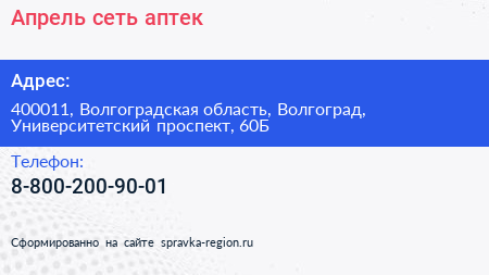 Апрель, сеть аптек по адресу 400011, Волгоградская область, Волгоград, Университетский проспект, 60Б в дальнейшем Организация, размещена в следующих категориях: