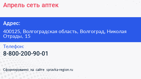 Апрель, сеть аптек по адресу 400125, Волгоградская область, Волгоград, Николая Отрады, 15 в дальнейшем Организация, размещена в следующих категориях: