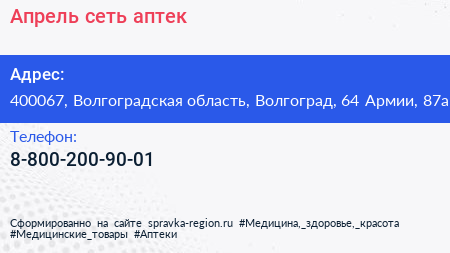 Апрель, сеть аптек по адресу 400067, Волгоградская область, Волгоград, 64 Армии, 87а в дальнейшем Организация, размещена в следующих категориях: