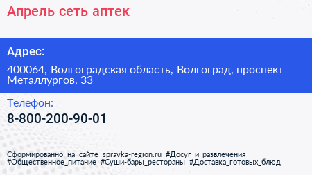 Апрель, сеть аптек по адресу 400064, Волгоградская область, Волгоград, проспект Металлургов, 33 в дальнейшем Организация, размещена в следующих категориях: