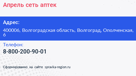 Апрель, сеть аптек по адресу 400006, Волгоградская область, Волгоград, Ополченская, 6 в дальнейшем Организация, размещена в следующих категориях: