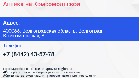 Аптека на Комсомольской по адресу 400066, Волгоградская область, Волгоград, Комсомольская, 8 в дальнейшем Организация, размещена в следующих категориях: