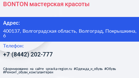 BONTON, мастерская красоты по адресу 400137, Волгоградская область, Волгоград, Покрышкина, 6 в дальнейшем Организация, размещена в следующих категориях: