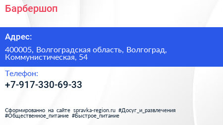 Барбершоп по адресу 400005, Волгоградская область, Волгоград, Коммунистическая, 54 в дальнейшем Организация, размещена в следующих категориях: