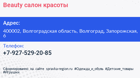 Beauty, салон красоты по адресу 400002, Волгоградская область, Волгоград, Запорожская, 6 в дальнейшем Организация, размещена в следующих категориях: