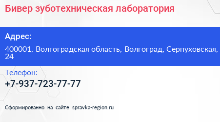 Бивер, зуботехническая лаборатория по адресу 400001, Волгоградская область, Волгоград, Серпуховская, 24 в дальнейшем Организация, размещена в следующих категориях: