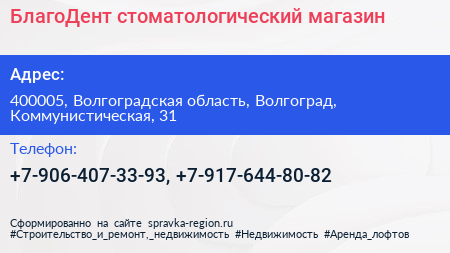 БлагоДент, стоматологический магазин по адресу 400005, Волгоградская область, Волгоград, Коммунистическая, 31 в дальнейшем Организация, размещена в следующих категориях: