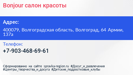 Bonjour, салон красоты по адресу 400079, Волгоградская область, Волгоград, 64 Армии, 137а в дальнейшем Организация, размещена в следующих категориях: