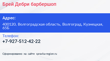 Брей Дебри, барбершоп по адресу 400120, Волгоградская область, Волгоград, Кузнецкая, 65Б в дальнейшем Организация, размещена в следующих категориях: