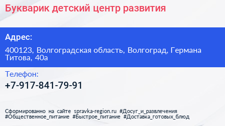 Букварик, детский центр развития по адресу 400123, Волгоградская область, Волгоград, Германа Титова, 40а в дальнейшем Организация, размещена в следующих категориях: