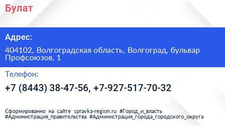 Булат по адресу 404102, Волгоградская область, Волгоград, бульвар Профсоюзов, 1 в дальнейшем Организация, размещена в следующих категориях:
