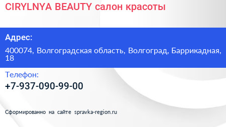 CIRYLNYA BEAUTY, салон красоты по адресу 400074, Волгоградская область, Волгоград, Баррикадная, 18 в дальнейшем Организация, размещена в следующих категориях: