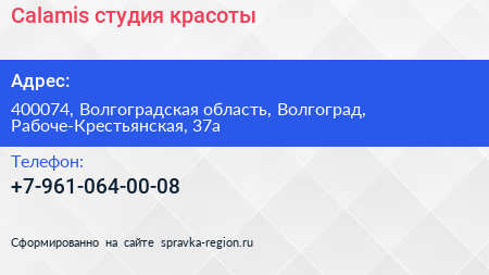 Calamis, студия красоты по адресу 400074, Волгоградская область, Волгоград, Рабоче-Крестьянская, 37а в дальнейшем Организация, размещена в следующих категориях: