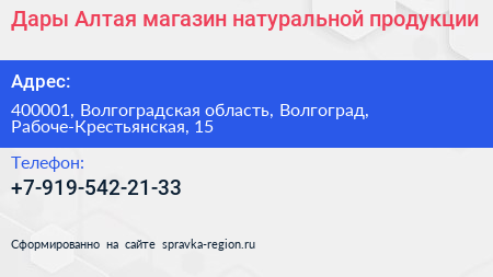 Дары Алтая, магазин натуральной продукции по адресу 400001, Волгоградская область, Волгоград, Рабоче-Крестьянская, 15 в дальнейшем Организация, размещена в следующих категориях: