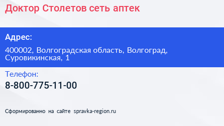 Доктор Столетов, сеть аптек по адресу 400002, Волгоградская область, Волгоград, Суровикинская, 1 в дальнейшем Организация, размещена в следующих категориях: