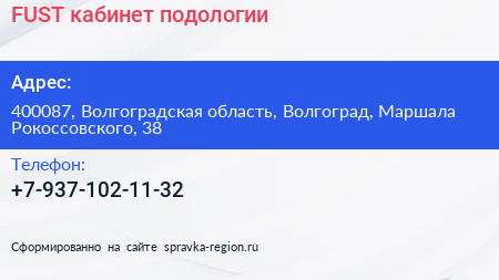 FUST, кабинет подологии по адресу 400087, Волгоградская область, Волгоград, Маршала Рокоссовского, 38 в дальнейшем Организация, размещена в следующих категориях:
