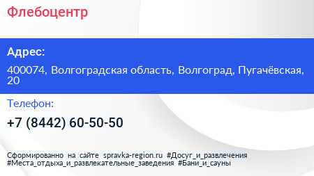 Флебоцентр по адресу 400074, Волгоградская область, Волгоград, Пугачёвская, 20 в дальнейшем Организация, размещена в следующих категориях: