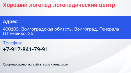 Хороший логопед, логопедический центр по адресу 400105, Волгоградская область, Волгоград, Генерала Штеменко, 36 в дальнейшем Организация, размещена в следующих категориях: