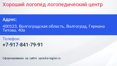 Хороший логопед, логопедический центр по адресу 400123, Волгоградская область, Волгоград, Германа Титова, 40а в дальнейшем Организация, размещена в следующих категориях: