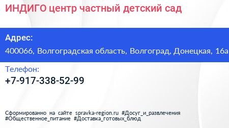ИНДИГО-центр, частный детский сад по адресу 400066, Волгоградская область, Волгоград, Донецкая, 16а в дальнейшем Организация, размещена в следующих категориях: